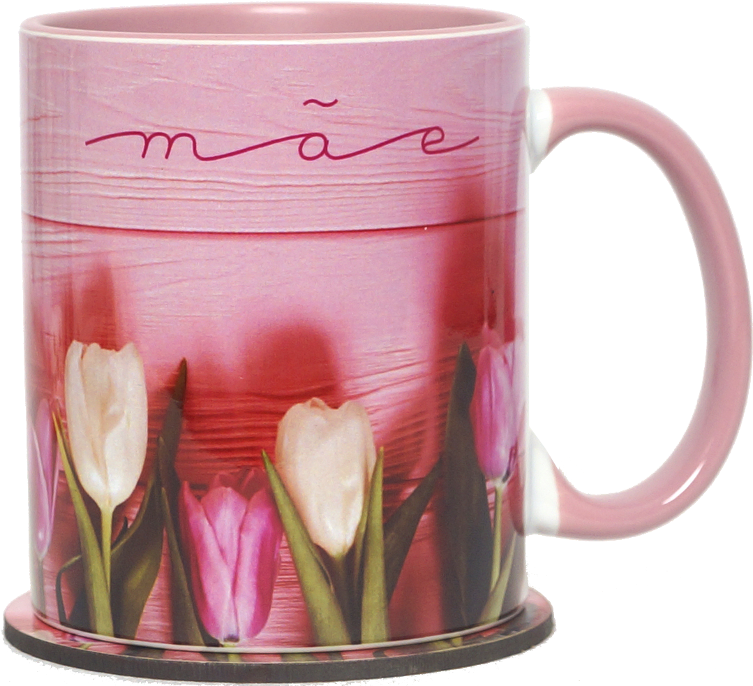 Caneca de cerâmica 325ml com fundo e alça rosa+suporte de copos redondo em MDF.