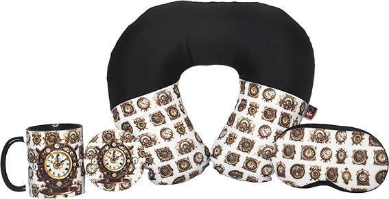 Com estampa de relógios estilizados, o Kit Hora Relax vem acompanhado de uma almofada de pescoço, uma máscara de olho, um suporte de copos e um caneca 360 graus. Ele é unissex, confortável.Lavável com secagem rápida, ele deixará seus momento relax mais charmosos.