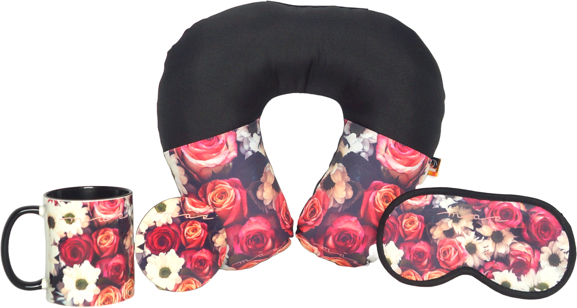 Kit com almofada de pescoço, caneca em cerâmica, suporte de caneca em MDF e máscara de olho, em estampa padrão de flores.