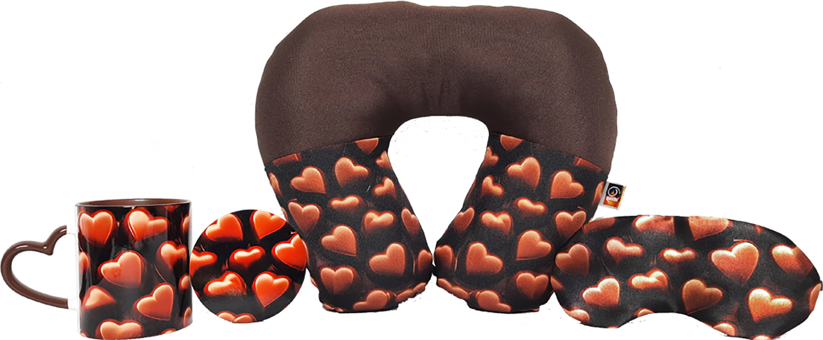Contém uma almofada de pescoço (adulto), uma caneca alto brilho 325ml com alça de coração, um suporte de copo redondo e uma máscara de olho.