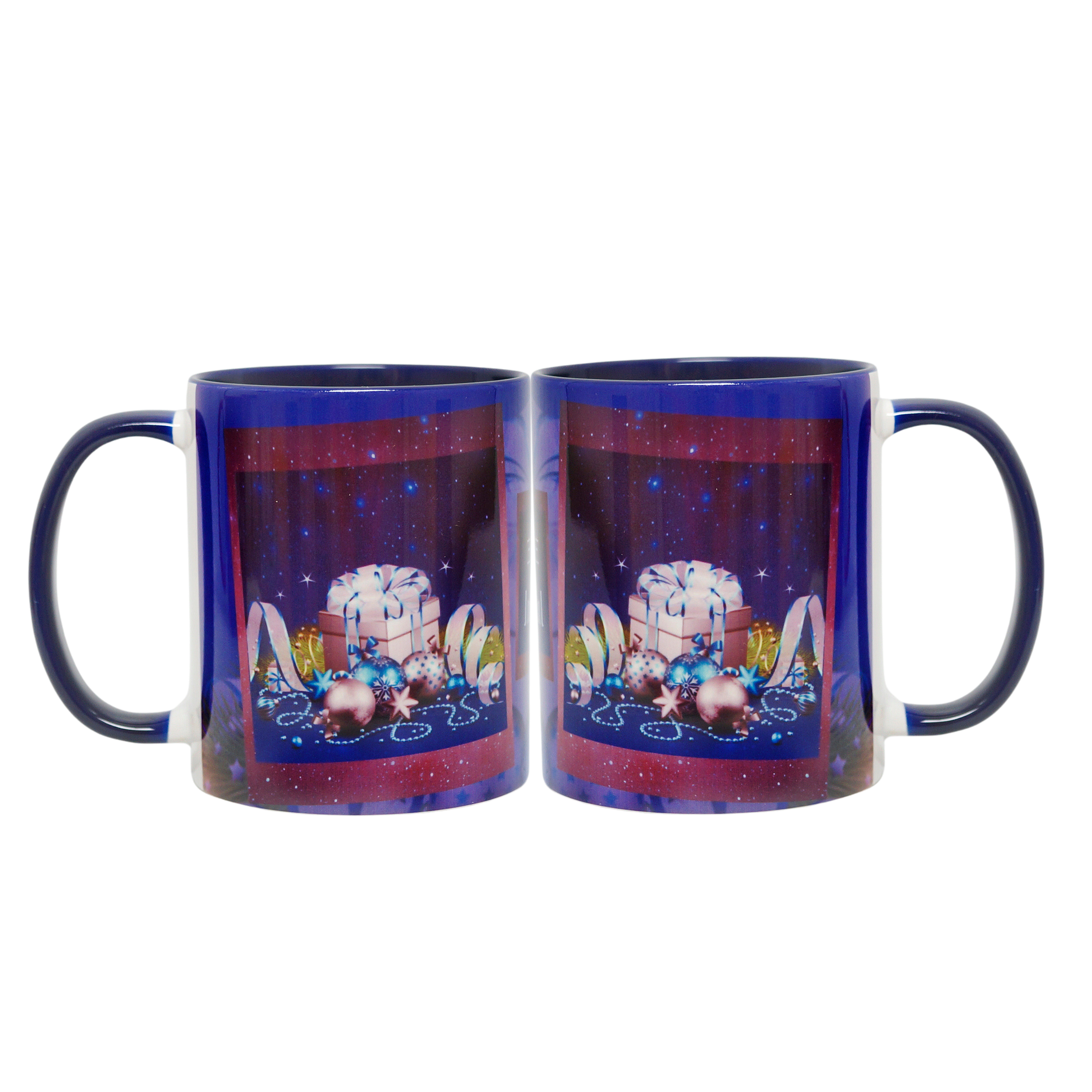 Par de canecas alto brilho, fundo e alça azul, 325ml, com estampa natalina+2 suportes de copo quadrados em MDF, na mesma estampa da caneca.