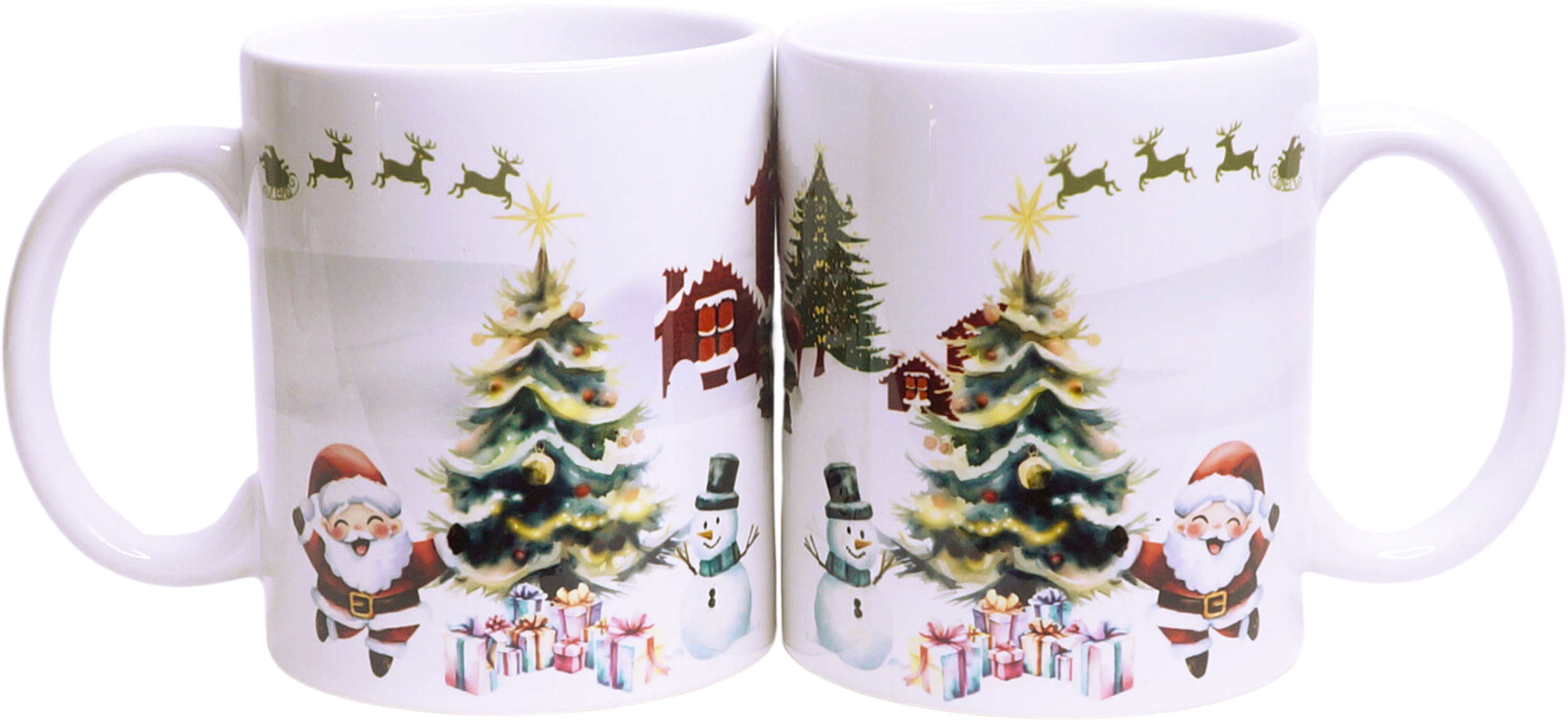 Canecas brancas, de cerâmica, alto brilho, 325ml, com estampa Papai Noel fundo branco.